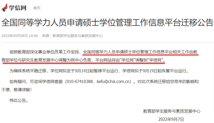 全国同等学力人员申请硕士学位管理工作信息平台相关工作由“学位网”迁移至“学信网”。此项变化已于2022年9月份开始实行。
