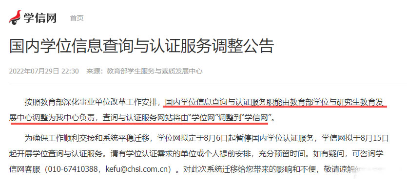 国内学位信息查询与认证服务职能由教育部学位与研究生教育发展中心调整为教育部学生服务与素质发展中心,查询与认证服务网站将由“学位网”调整到“学信网”。此项变化已于2022年8月份开始实行。