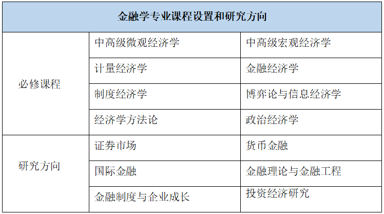 本专业主要通过学习和掌握金融学和经济学的基础理论知识,培养具有相关数理理论和经典计量经济学分析工具,熟悉金融学学科演进,基于中国实际的金融学理论和金融产业发展未来方向的重要的经济学、金融学问题专家和金融领域的应用型与复合型专门人才。